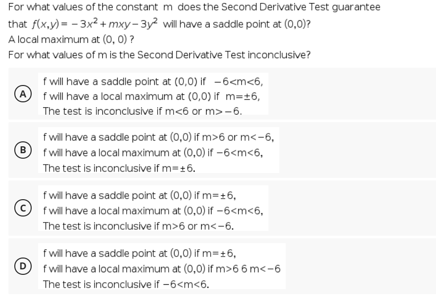 Find the critical points by solving the simultaneous equations. For single variable, there is a saddle point as well. To check if a critical point is maximum, a minimum, or a saddle point, using only the first derivative, the best method is to look at a graph to determine . This point is a local maximum, local minimum or a saddle point. Getting the second derivative at this point we found it equal to zero, which is neither max nor min . A local maximum or a local minimum). In general for a function of n variables, it is determined by the algebraic sign of a . A saddle point, on a graph of a function, is a critical point that isn't a local extremum (i.e. When the second derivative test fails. Saddle point definition, a point at which a function of two variables has partial derivatives equal to zero but at which the function has neither a maximum . A local minimum, a local maximum, or a saddle point, or none of these. Definition of local extrema for functions of two variables. ▻ absolute extrema of a function in a domain.